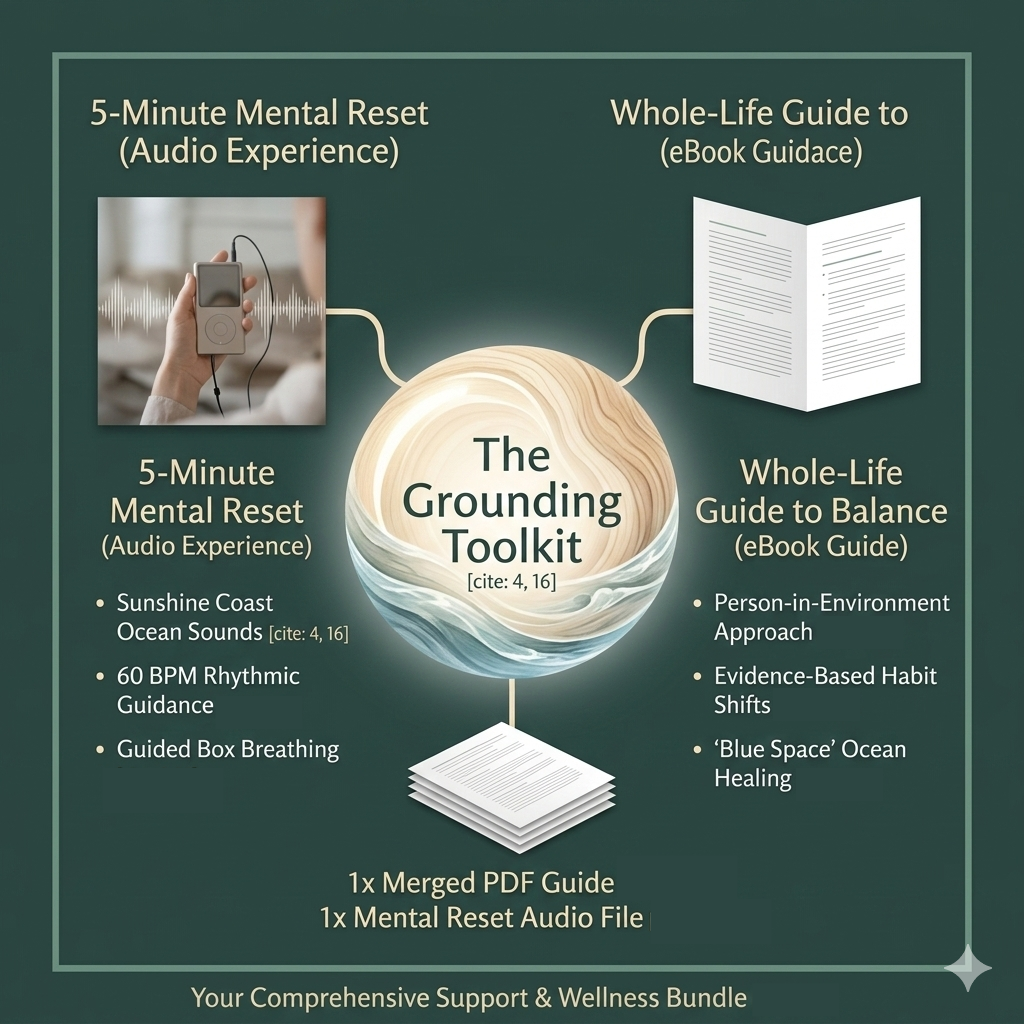 The 5-Minute Mental Reset: A clinical, 60-BPM sensory audio experience featuring Sunshine Coast ocean sounds and guided Box Breathing to manually "reboot" your stress response.